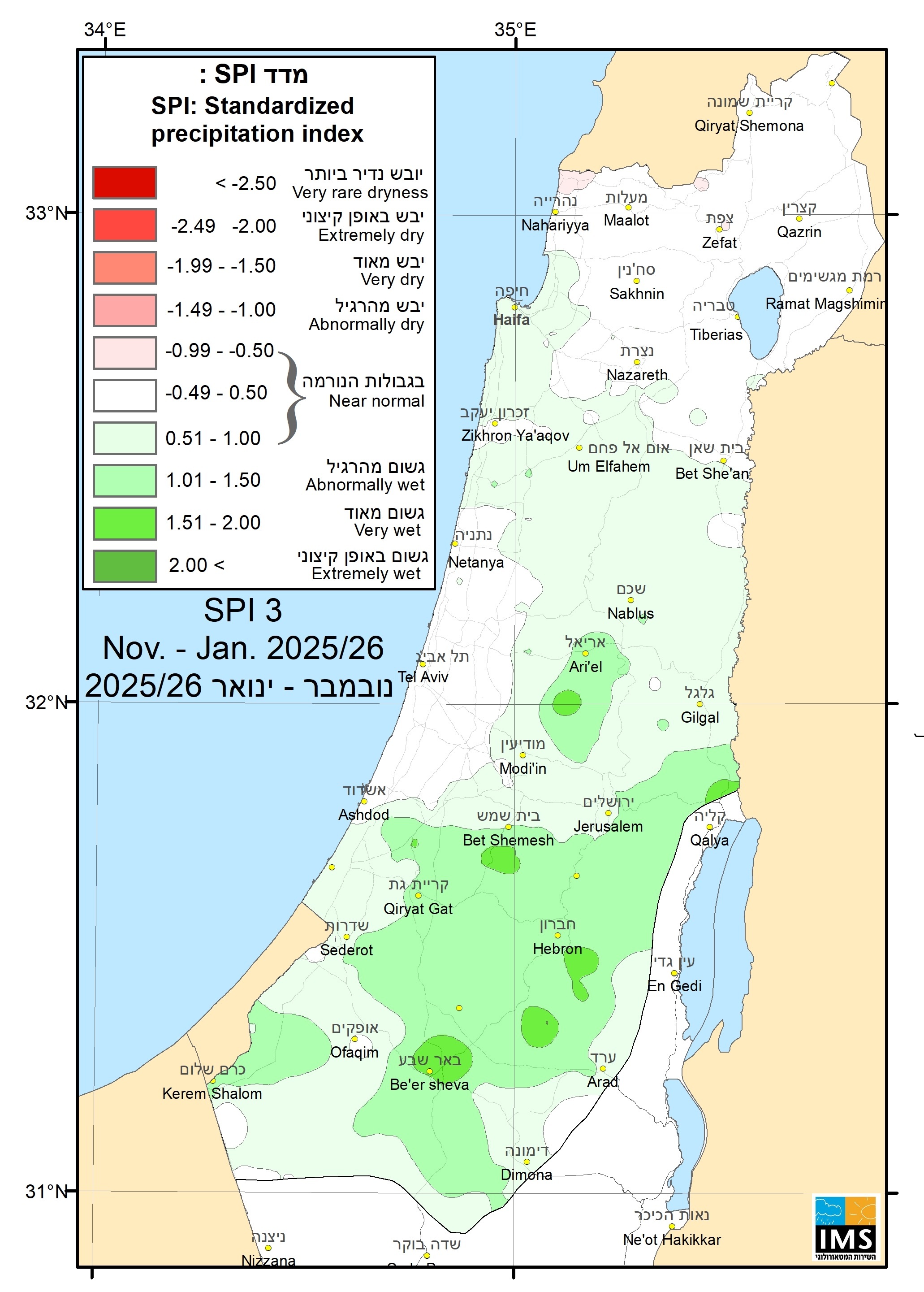 לאחר ינואר שהתאפיין בשונות אזורית בכמויות הגשם וברמה כלל ארצית היה מעט מתחת לממוצע, ניתן לראות במפת המדד של התקופה נובמבר 2025 עד ינואר 2026, SPI_NDJ_25_26, שבדומה למה שהיה בסוף דצמבר רוב האזורים בצפון הארץ ובמרכזה עד קו אשדוד-בית שמש-ירושלים הם בגבולות הנורמה. ישנם אזורים כמו מישור החוף הצפוני, השומרון וצפון הרי יהודה שהם בגבולות הנורמה עם נטיה כלפי מעלה וחלקים מהשומרון שהם אף גשומים מהרגיל. אזור מצומצם בצפון מערב הארץ הוא בגבולות הנורמה עם נטיה כלפי מטה. לעומת זאת רוב האזור שמדרום לקו אשדוד ירושלים גשום מהרגיל עם מספר מוקדים שאף מוגדרים כגשמיום מאוד.